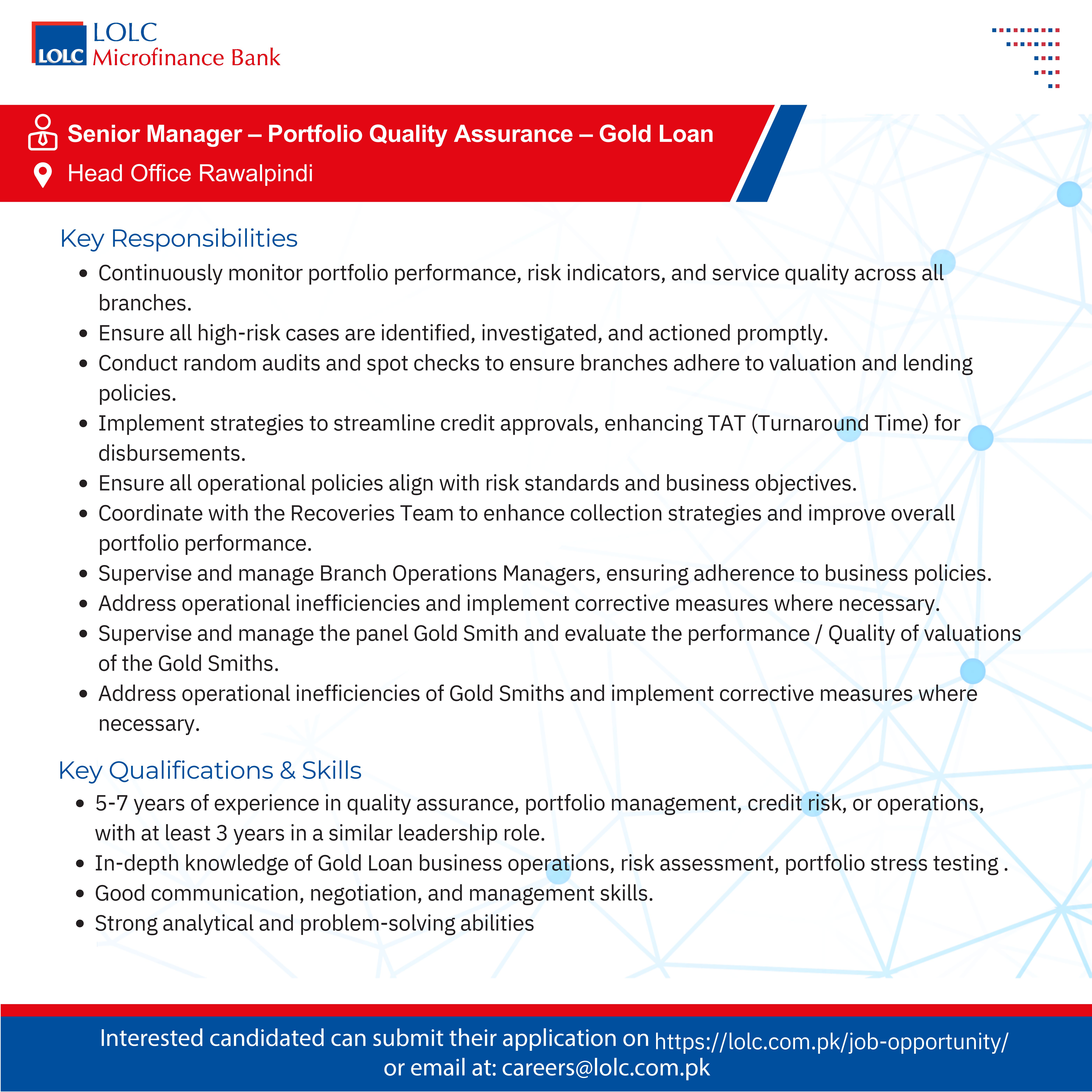 Senior Manager – Portfolio Quality Assurance – Gold Loan